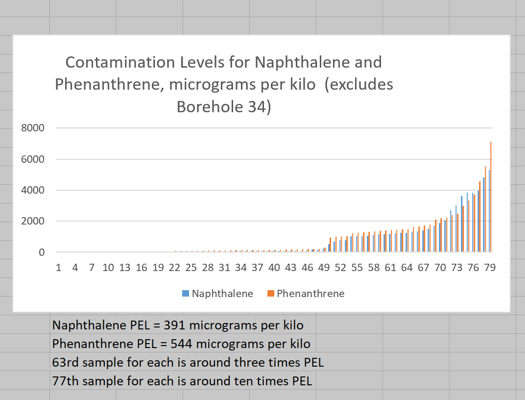 We then set about finding out by how much they exceeded this level. For this, we chose two hydrocarbons as an example – Naphthalene and Phenanthrene. We gathered all of the sample results for these two chemicals and rank ordered them. The result is shown in the chart below: