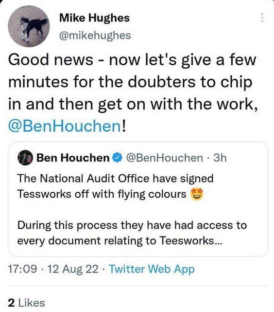 So, “signed off with flying colours” then. Now some of you may be wondering how TVM acquired this tweet, given that Houchen blocked us on Twitter several months ago. Well, the answer is that Mike Hughes provided it, adding the following comment:
