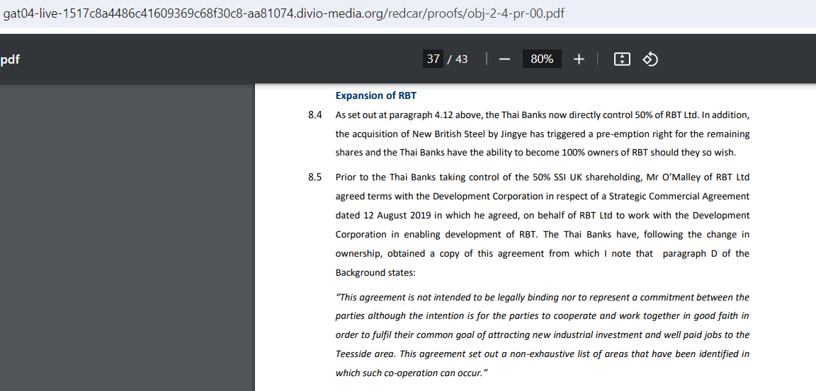 Their negotiation with Houchen and STDC is not in the public domain. Their opening gambit with the Thai banks, however, is reported in the evidence submission of Simon Meluish-Hancock on behalf of SSI. On 20 December they approached SSI UK with an offer to buy the “the assets of SSI UK” alongside the land at RBT for which they had just taken an option: