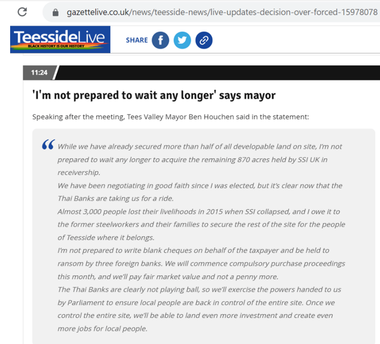 When STDC was set up the bulk of the 4,500 acres of derelict land it intended to redevelop was in private hands. It immediately set about buying up land parcels from those private owners. Most landowners sold their holdings willingly, but a group of Thai banks who now owned the land formerly held by SSI UK who had operated Redcar Steelworks until 2015, refused to sell on STDC’s terms.