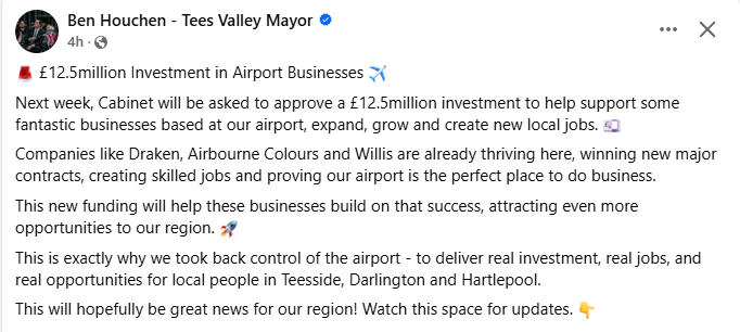 Tees Valley mayor, Ben Houchen has announced today that he will be asking TVCA cabinet to approve a £12.5 million ‘investment’ in Teesside Airport, to “help support some fantastic business based at our airport, expand, grow and create new local jobs.” Not to cover the £13.4 million losses declared recently, then. And definitely not to deal with the situation reported recently in Private Eye that Houchen was recently briefed that the airport would run out of money by June unless it had an injection of cash.