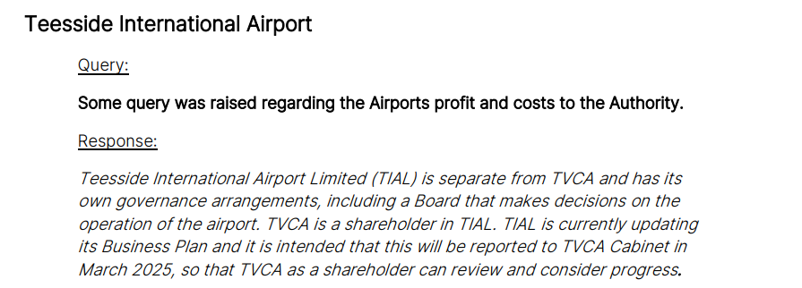 A recent report in the Financial Times (“Auditors raise red flags at public body run by Ben Houchen”, 18 December 2025) stated that the TVCA has advanced the airport £128 million in loans since 2019. This figure does not include the amount we have uncovered in the TVCA expenditure files.
