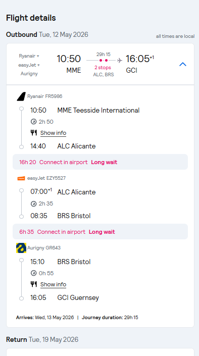 So, £10 million last year, and £12.5 million this year. And new routes and new carriers continue to be elusive. In response to this, the airport’s marketing is becoming ever more creative. Today, it is advertising holidays to Guernsey. Just out of curiosity, had a look at making a booking on the first such flight on 12 May. What we were offered, for £329 return, was an outward flight lasting a little over 29 hours involving stopovers first in Alicante and then in Bristol. The journey of a lifetime?