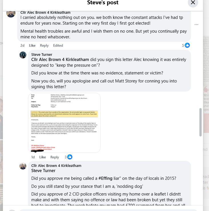 Nonetheless, disturbed by the allegations made against him in 2021, Turner states that he became increasingly isolated. This, we can corroborate. Our 2021 report, The Agonies of Steve Turner, Cleveland Police and Crime Commissioner, compared his fate to that of Owen Paterson. While Paterson was supported by 250 MPs in Parliament following complaints about his conduct, there was silence from those that Turner might have expected to leap to his defence – Tees Valley mayor, Ben Houchen, ex-MSEC MP, Simon Clarke and ex-Redcar MP, Jacob Young among them.