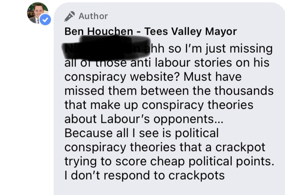 Instead, in the course of the evening, as some of our readers started to ask questions on Houchen’s Facebook page, Tees Valley Monitor was the subject of a series of derogatory and highly inaccurate statements on Houchen’s Facebook as well as that of Redcar MP, Jacob Young. We were referred to obliquely as ‘Labour Party propaganda pages’ and explicitly as ‘a small group of people committed to seeing our area fail’.