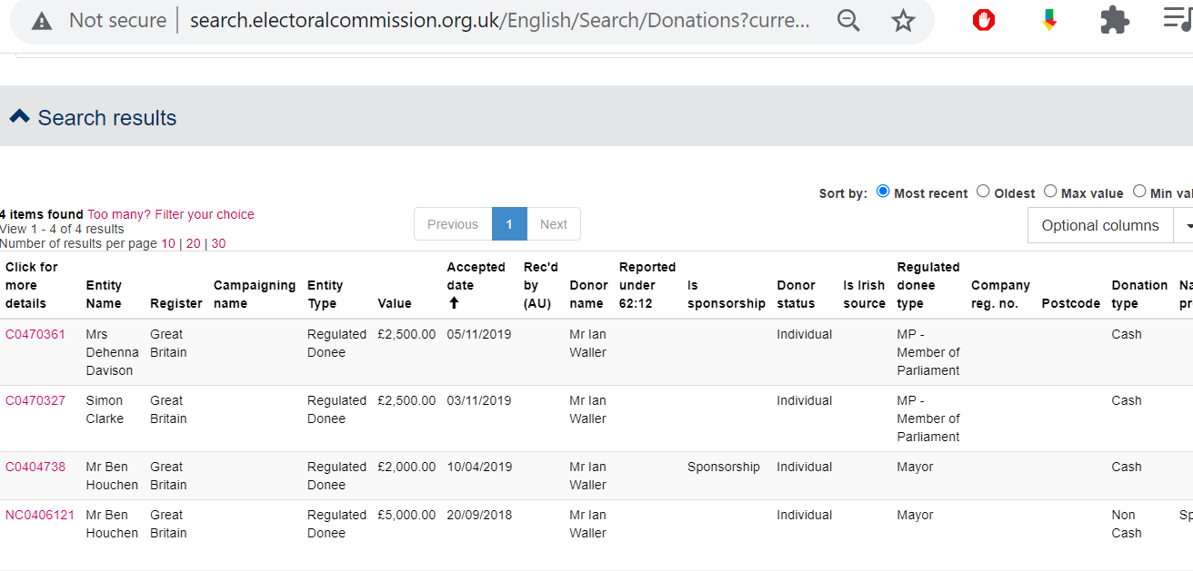All of which may help to explain Houchen’s reluctance to become involved on behalf of the planning authority. There is another fact, a more personal one, that may be materially relevant here. Northern Land Management, the STDC partner, has a third director – one Ian Waller. Ian Waller is also a director of Theakston Estates . One thing that is particularly interesting about Waller is that his name also appears in the Electoral Commission’s register of political donations: