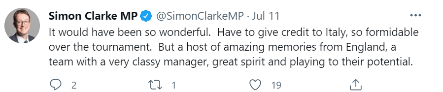 It must be heart warming for Gareth Southgate to know that he has the enthusiastic approval of Tory MP, Simon Clarke. Clarke had this to say on Twitter on 11 July: