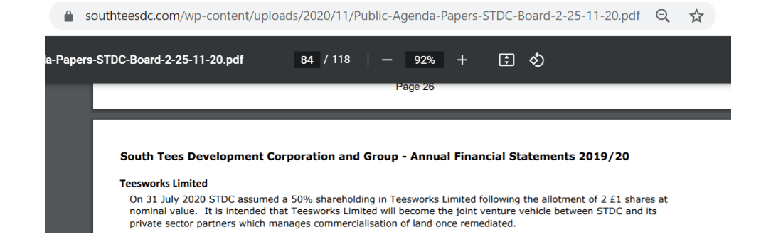 The management of that ‘progress’ is technically in the hands of the joint venture company, Teesworks Ltd, formerly STEL, as shown here in a STDC board document from 2020: