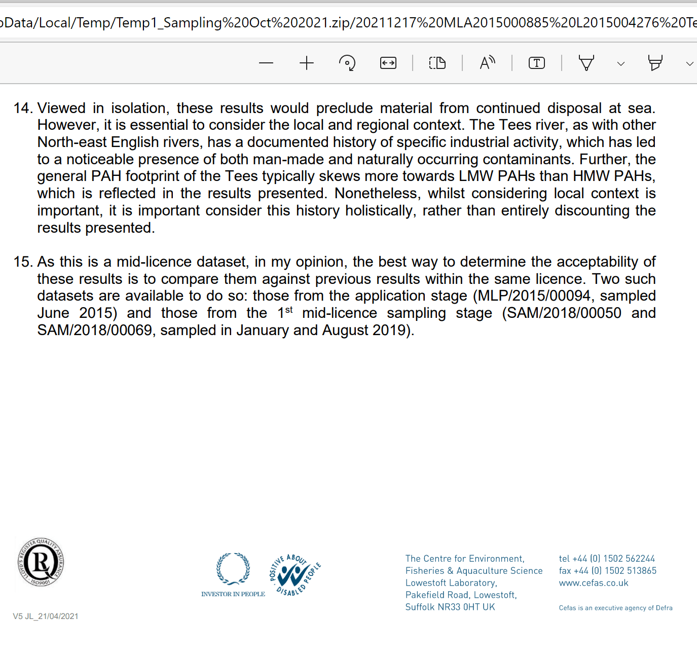 We ourselves were puzzled by some of what was contained in the Royal Haskoning Environmental Impact Assessment for the Northern Gateway Container Terminal. Its sediment sampling revealed that of the 22 PAHs tested for, the concentrations of 19 of them exceeded Defra’s threshold for safe disposal at sea. The report recommended disposal at sea nonetheless, and this was accepted. The MMO issued the licence allowing all of the dredge material to be disposed of at the Tees Bay C drop zone. This contradicts the following statement from the May 2022 Defra Report: