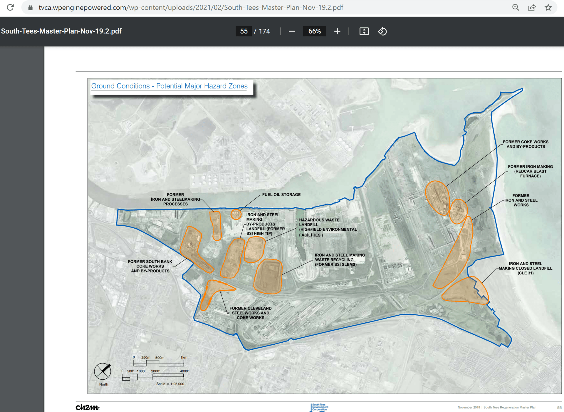 In its Masterplan, the South Tees Development Corporation has helpfully marked the places where there are, or have been, coke ovens, where pyridine was produced as a by-product and where the surrounding area is therefore contaminated with it. It also shows hazardous waste landfill sites (which may be of some use in the future, as we believe that the sediment extracted from the estuary which was prohibited from disposal at sea remains on the site. At High Tip, to be precise).