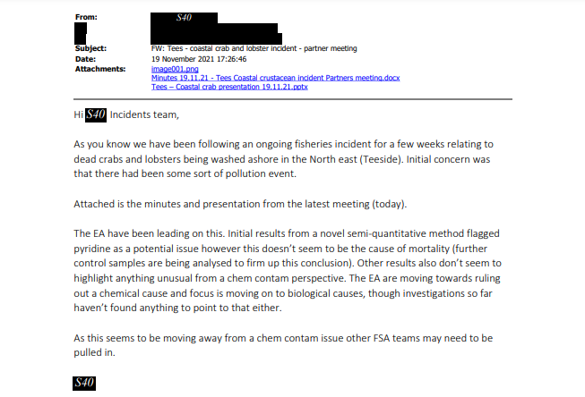 Some relevant information is contained in FOI disclosures from the Food Standards Agency. The first is an email from 9 November about the EA finding high levels of pyridine in crab: