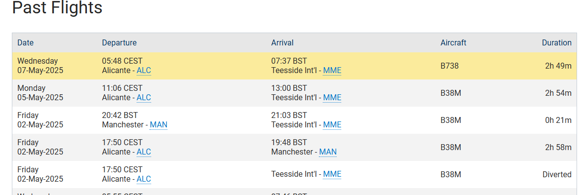 At this point we started to wonder how long the airport staffing issue had continued, and so we checked the tracker to see whether there had been delays to earlier flights. The movement that preceded the Alicante arrival was the 19.15 departure to Humberside, which the tracker shows departed on time.