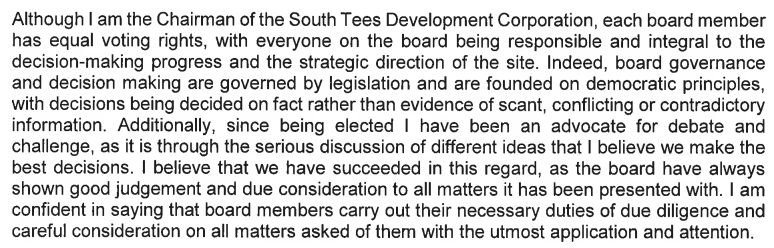 This may come as a surprise to the panel who recently presented the Tees Valley Review into corruption at Teesworks, who were convinced that Houchen has long since done his best to keep the STDC board in the dark about key decisions, preferring instead to rely on the advice of a few select individuals.