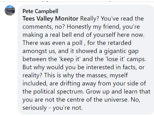 It has infuriated him to find that some nobodies have had the nerve to question his decision to blow the tower up. Some nobodies who think that that stinking pile of concrete full of rebar should still be standing just because it’s a symbol of Teesside’s importance in building bridges across the world and a unique example of brutalist architecture and could be a major attraction as part of the region’s nascent tourist industry, a bit like Battersea Power Station, for example. Just who do they think they are?