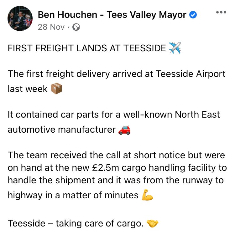 At the end of August 2022, the £2.5 million air freight facility finally opened. Cue another good news piece on Houchen’s Facebook page: