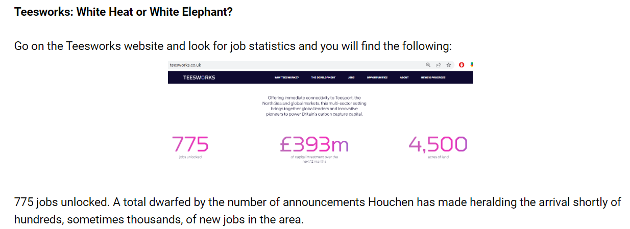 Our report describes one instance of the habit of both Houchen and TVCA officers to exaggerate the significance of developments at Teesworks. While preparing this, we looked back at what we had written about the GE Renewables crisis. In doing so, we came across another example of misinformation/disinformation by Teesworks. Much has been said about the jobs that the project will bring. In March 2022, we published a screenshot of the number of jobs ‘unlocked’ by Teesworks. It looked strangely familiar. So we took another screenshot of that statistic as it appears on their website today: