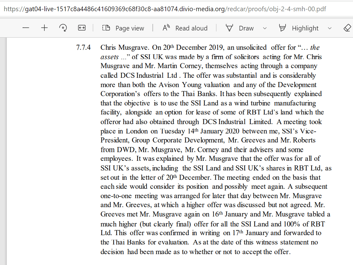 The revelation in the evidence of Simon Melhuish-Hancock, on behalf of SSI states that in December 2019, solicitors acting on behalf of Corney and Musgrave had approached the Thai banks with a proposal to buy the SSI land and SSI’s 50% share in the Bulk Terminal. That offer, he reports, was substantially higher than that offered by the STDC: