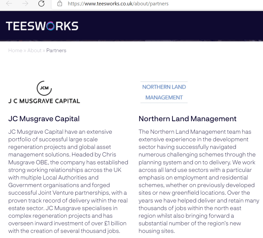 Notice that JC Musgrave Capital’s achievement is particularly impressive here – “an extensive portfolio of successful large scale regeneration projects … established strong working relationships across the UK …creation of several thousand jobs”. No wonder that Houchen was keen to get this company on board. And its achievement is all the more impressive when you take into consideration the fact that the company was only set up in November 2019, five months before lockdown.