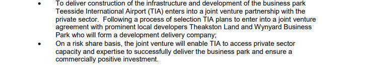 On 6 December 2019, the developers set up a company – Teesside International Land Ltd – that would later become a shareholder of Teesside International Airport Business Park Ltd. The plan for the business park involves the TVCA lending £23.6 million to the Teesside Airport company, not to the joint venture company. As has happened subsequently at Teesworks, Corney and Musgrave are not liable for repayment of the debt-financed project. This from the same report,