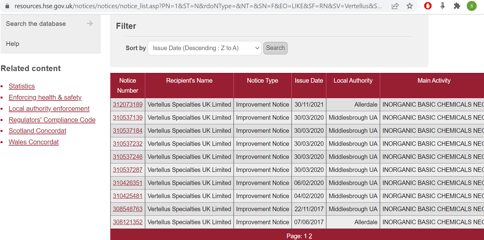 In addition to this, as the table below indicates, the plant had a turbulent relationship with the Health and Safety Executive: