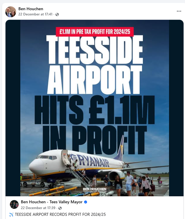 Tees Valley Mayor celebrates Teesside Airport's success in social media post