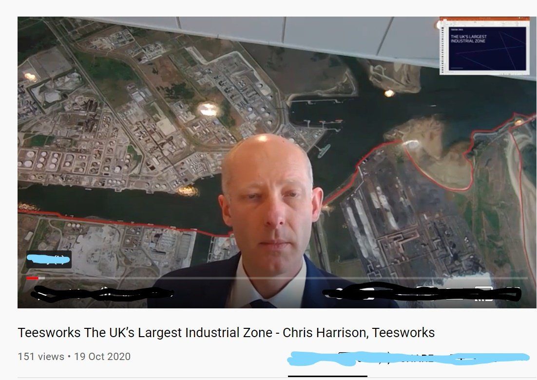 On the other hand, the inquiry was attended by one Chris Harrison, who is on the board of the South Tees Development Corporation. Here’s Harrison standing in for Houchen at a virtual presentation on the Teesworks scheme: