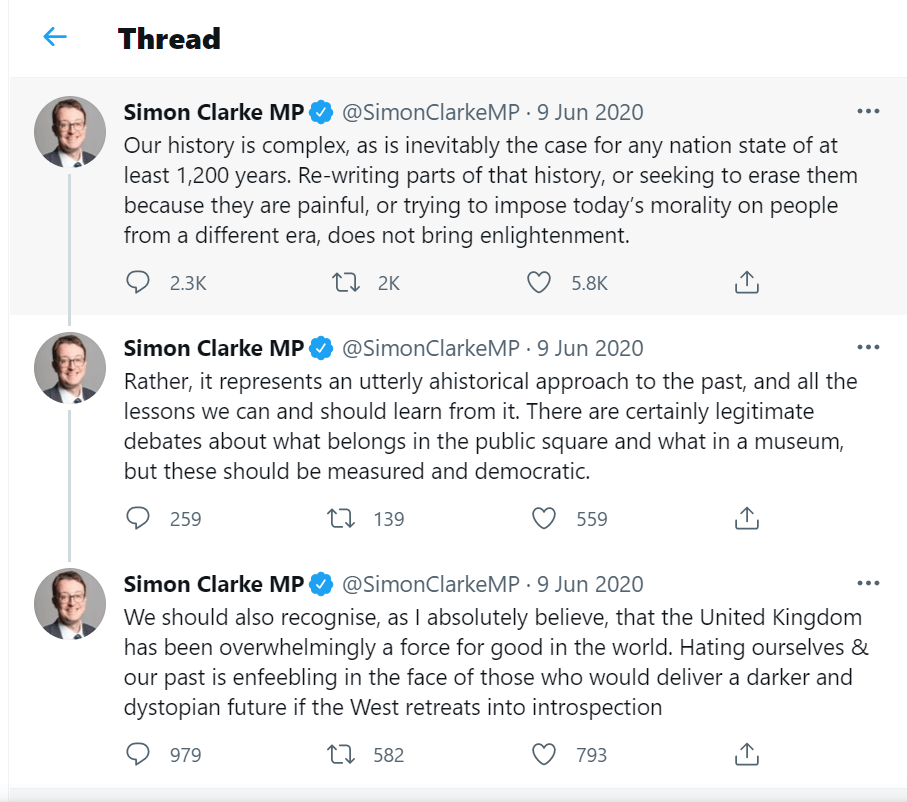 Earlier in 2020 he had had quite a bit to say about the BLM agenda in relation to the removal of statues. He took exception to the reputations of some of the great men of English history being called into question by the BLM movement, and provided a short history lecture to explain to them the error of their ways. Sadly for Clarke, he begins his intervention by dropping a clanger: