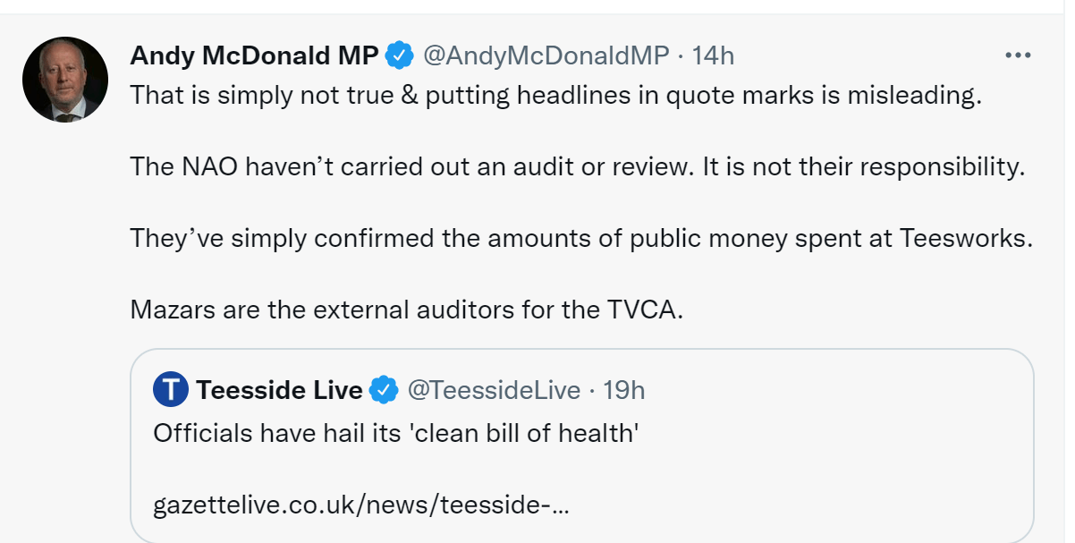 So, what, precisely, inspired the hapless business editor of the Northern Echo to start waxing eloquent the achievement of Teesworks? The simple answer is that, whatever the National Audit Office has had to say about it, it is unpublished. And Houchen PR has previous when it comes to unpublished reports.