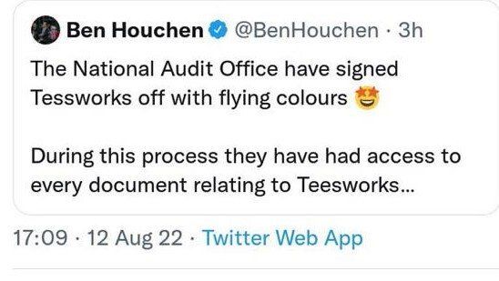 So, “signed off with flying colours” then. Now some of you may be wondering how TVM acquired this tweet, given that Houchen blocked us on Twitter several months ago. Well, the answer is that Mike Hughes provided it, adding the following comment: