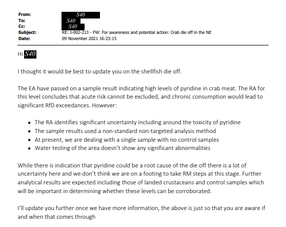 Some relevant information is contained in FOI disclosures from the Food Standards Agency. The first is an email from 9 November about the EA finding high levels of pyridine in crab: