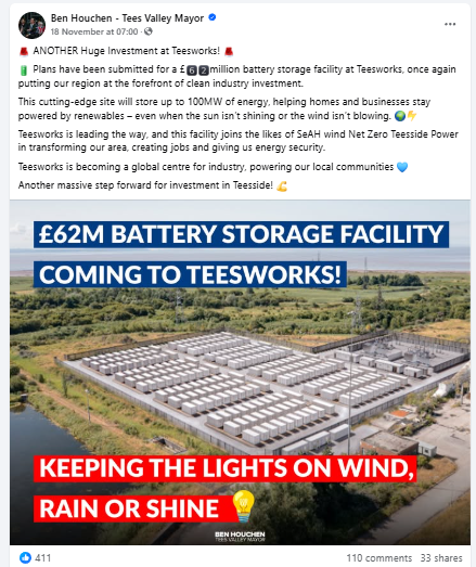 Of the things that Houchen chose not to mention in this post is that the development of a much larger battery energy storage system (BESS) was announced in the local press earlier in the year. On 22 May, the Gazette published an article on the proposed facility under the title “£1bn battery storage project poised to take shape at Teesworks”, stating
