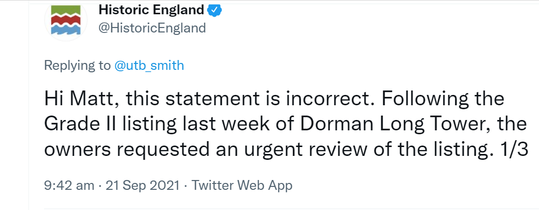 Except that, as it turns out, Historic England is not about to allow itself to be dobbed in it by Houchen. A reader contacted them about the issue and got the following reply: