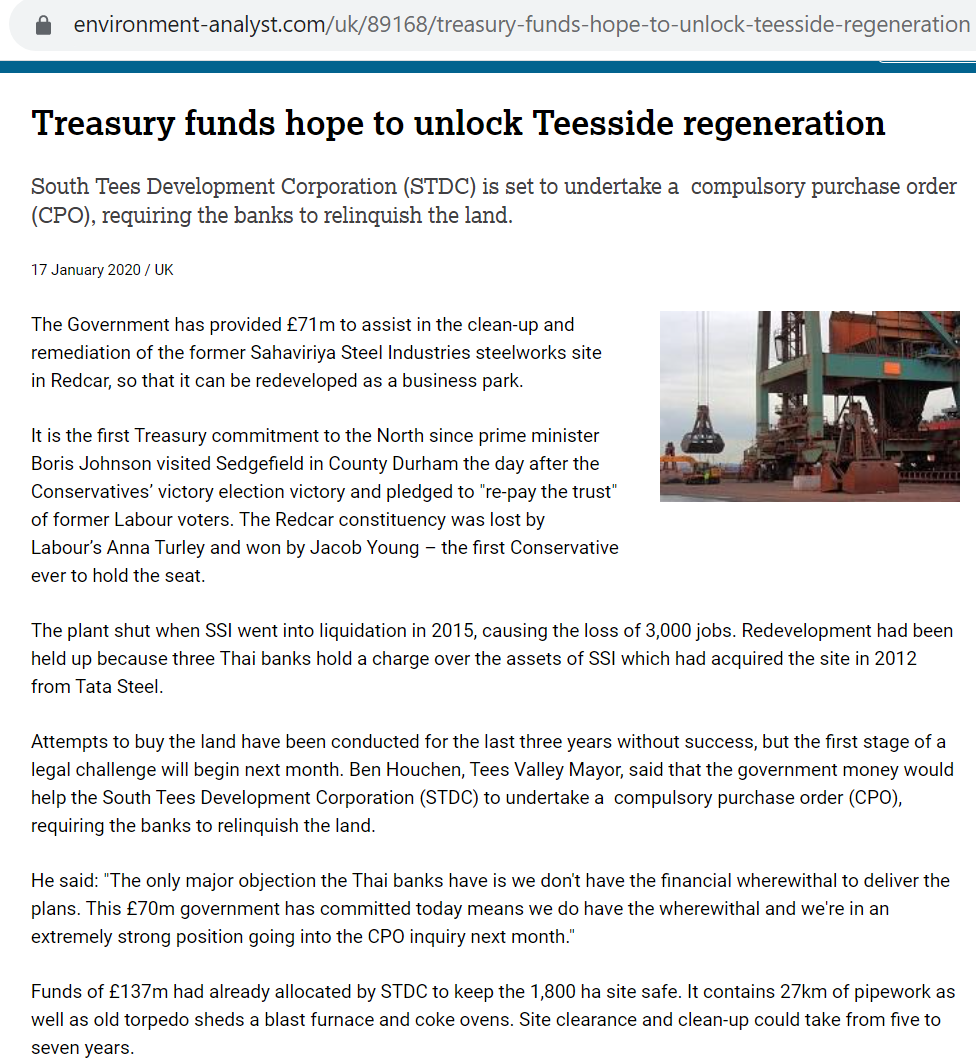 Tata owned 1420 acres of derelict land on the site. At the beginning of 2019, they prepared to sell this to the Corporation. To manage the purchase (and the associated liabilities) the Corporation set up a wholly-owned company – South Tees Developments Ltd, a so-called Special Purpose Vehicle (SPV). It was intended that this company would handle the purchase of both Tata and eventually SSI land (Acquisition-of-Land-on-STDC-Site)