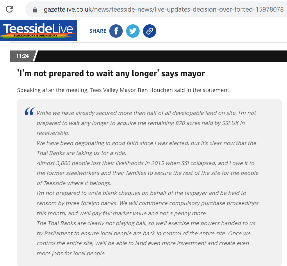 Notice that Houchen’s here statements might be neatly summed up as ‘Take Back Control’. He was using the purchase of SSI land to play to the gallery. And the Thai banks did not take kindly to being used as props in a political campaign.